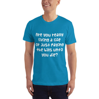 quick view American Apparel Are you really living a life or just paying the bills until you die? - American Apparel - Unisex Fine Jersey Short Sleeve T-Shirt PRINT-37584 MSRP: $27.69 b2001 Unisex Fine Jersey Short Sleeve TShirt/bbr/Fitted, comfortable, and softthis tshirt was made just for you And it can withstand several washings while maintaining its shape, so its great for... Add to Wish List Add to My Wish List Create New Wish List