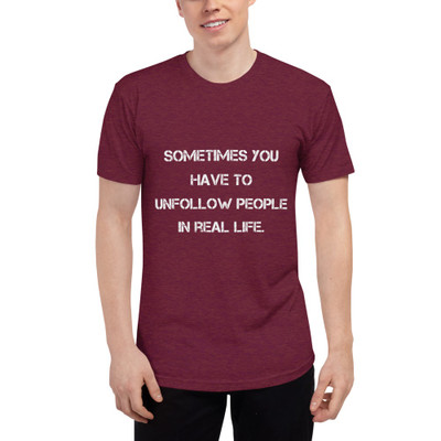 quick view American Apparel Sometimes you have to unfollow people in real life. - American Apparel - Unisex Short Sleeve Track Shirt MSRP: $29.00 TR401 Unisex Tri-Blend Short Sleeve Track ShirtEnjoy a brand new crew neck track shirt with a fit, feel and durability of a well-loved vintage piece. This tri-blend track t-shirt is made from a mix... Add to Wish List Add to My Wish List Create New Wish List