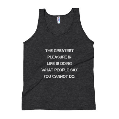 quick view American Apparel The greatest pleasure in life is doing what people say you cannot do. - American Apparel - Unisex Soft Tri-Blend Tank PRINT-43014 MSRP: $26.99 bTR408W Unisex Soft TriBlend Tank/bbr/This tank features a loose drape, perfect for the summer heat or for layering Its made of an ultrasoft triblend fabric br/ 50 Polyester/25 Cotton/25... Add to Wish List Add to My Wish List Create New Wish List