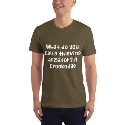 quick view American Apparel What do you call a thieving alligator? A Crookodile - American Apparel - Unisex Fine Jersey Short Sleeve T-Shirt PRINT-37622 MSRP: $27.69 b2001 Unisex Fine Jersey Short Sleeve TShirt/bbr/Fitted, comfortable, and softthis tshirt was made just for you And it can withstand several washings while maintaining its shape, so its great for... Add to Wish List Add to My Wish List Create New Wish List
