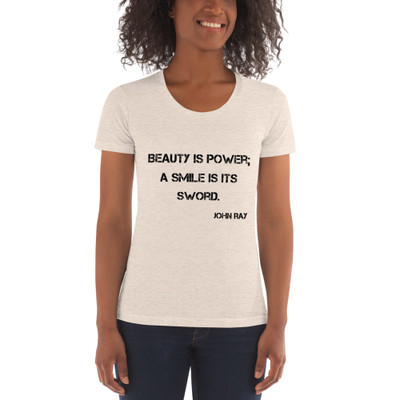 quick view American Apparel Beauty is power; a smile is its sword. - John Ray - American Apparel - Women's Tri-Blend T-Shirt PRINT-28817 MSRP: $31.90 bTR301W Womens TriBlend TShirt/bbr/Youll love the fit and feel of this super soft tshirt Itll instantly feel like that favorite, wellworn shirt you love br/ 50 Polyester/25 Cotton/25 Rayon br/ ... Add to Wish List Add to My Wish List Create New Wish List