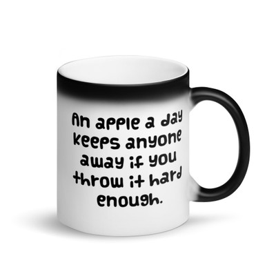 An apple a day keeps anyone away if you throw it hard enough. - Glossy Black Magic Mug Funny quotes 7848265
