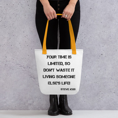 quick view Your time is limited, so don't waste it living someone else's life! - Steve Jobs - Tote Motivational quotes 7815950 MSRP: $26.99 All-Over Print ToteA spacious and trendy tote bag to help you carry around everything that matters. • 100% spun polyester fabric • Bag 15" x 15" (38.1cm x 38.1cm) • Capacity – 2.6 US gal (10l) • Maximum weight limit – 44lbs (20kg) • Dual... Add to Wish List Add to My Wish List Create New Wish List Compare