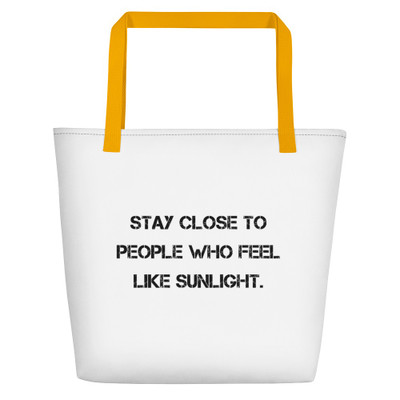 quick view Stay close to people who feel like sunlight. - Beach Bag Motivational quotes 7811769 MSRP: $40.28 All-Over Print Beach BagA trendy beach bag, where you can put everything that matters when hitting those warm beaches. • 100% polyester fabric • Maximum weight limit – 44lbs (20kg) • Large inside pocket • Comfortable cotton webbing handles •... Add to Wish List Add to My Wish List Create New Wish List Compare