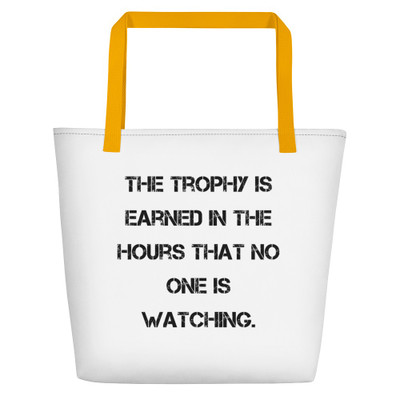 quick view The trophy is earned in the hours that no one is watching. - Beach Bag Motivational quotes 7832479 MSRP: $37.30 All-Over Print Beach BagA trendy beach bag, where you can put everything that matters when hitting those warm beaches. • 100% polyester fabric • Maximum weight limit – 44lbs (20kg) • Large inside pocket • Comfortable cotton webbing handles •... Add to Wish List Add to My Wish List Create New Wish List Compare