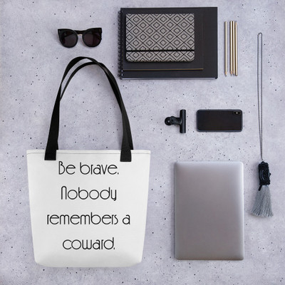 quick view Be brave. Nobody remembers a coward. - Tote Motivational quotes 7852988 MSRP: $25.91 All-Over Print ToteA spacious and trendy tote bag to help you carry around everything that matters. • 100% spun polyester fabric • Bag 15" x 15" (38.1cm x 38.1cm) • Capacity – 2.6 US gal (10l) • Maximum weight limit – 44lbs (20kg) • Dual... Add to Wish List Add to My Wish List Create New Wish List Compare