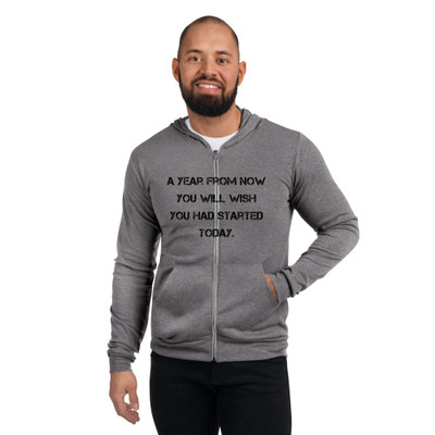 quick view Bella + Canvas A year from now you will wish you had started today. - Bella + Canvas - Unisex Triblend Lightweight Zip Hoodie MSRP: $42.00 3939 Unisex Triblend Lightweight Zip HoodieFor when you get chilly on a summer evening by the lake, or simply need something comfy to throw on, this lightweight unisex zip hoodie with a modern fit,... Add to Wish List Add to My Wish List Create New Wish List