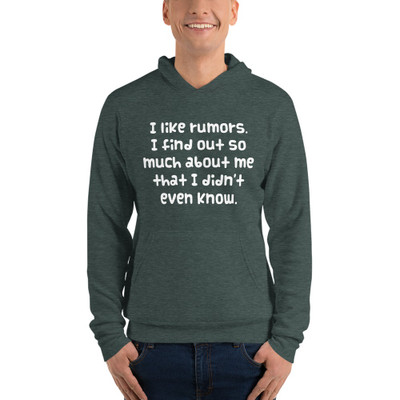 quick view Bella + Canvas I like rumors. I find out so much about me that I didn't even know. - Bella + Canvas - Unisex Fleece Pullover Hoodie PRINT-50925 MSRP: $43.75 b3719 Unisex Fleece Pullover Hoodie/bbr/A soft and comfy unisex hoodie that fits all your hoodie needs The fleece fabric makes it a great partner all year round, be it a summer evening on the beach,... Add to Wish List Add to My Wish List Create New Wish List