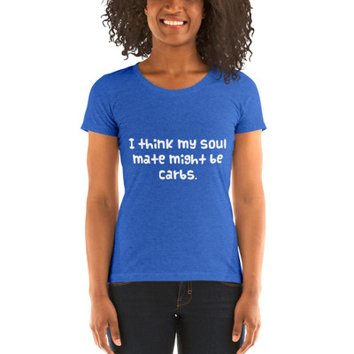 quick view Bella + Canvas I think my soul mate might be carbs. - Bella + Canvas - Ladies' Triblend Short Sleeve T-Shirt MSRP: $27.63 8413 Ladies" Triblend Short Sleeve T-ShirtA super-soft, form-fitting, breathable t-shirt with a slightly lower neckline than a classic t-shirt. • Tri-blend construction (50% polyester/25%... Add to Wish List Add to My Wish List Create New Wish List
