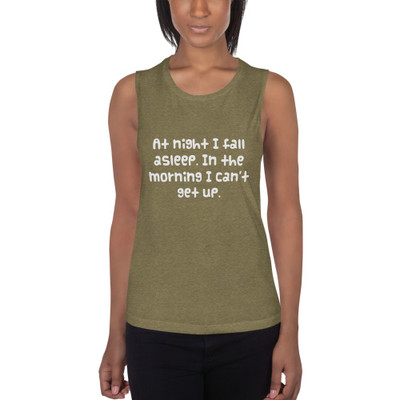 quick view Bella + Canvas At night I fall asleep. In the morning I can't get up. - Bella + Canvas - Women's Flowy Muscle Tank PRINT-49499 MSRP: $28.28 b8803 Womens Flowy Muscle Tank/bbr/This comfortable muscle tank is soft and flowy with low cut armholes for a relaxed look br/ 65 polyester/35 viscose br/ Low cut armholes br/ Curved bottom... Add to Wish List Add to My Wish List Create New Wish List