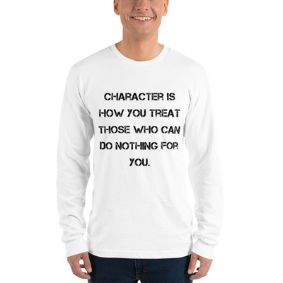 quick view American Apparel Character is how you treat those who can do nothing for you. - American Apparel - Unisex Fine Jersey Long Sleeve T-Shirt MSRP: $28.34 2007 Unisex Fine Jersey Long Sleeve T-ShirtThis long-sleeved shirt is made of the ultra-smooth American Apparel cotton, and it has comfy long sleeves to protect you from the elements. The sleeves are cuffed at the hand for a tapered look that adds a... Add to Wish List Add to My Wish List Create New Wish List Compare