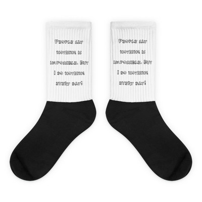 quick view People say nothing is impossible. But I do nothing every day! - Black Foot Socks Funny quotes 7828006 MSRP: $19.53 Black Foot Sublimated SocksThese socks are extra comfortable thanks to their cushioned bottom. The foot is black with artwork printed along the leg with crisp, bold colors that won"t fade. • 60% nylon/22% cotton/18% spandex • Crew length •... Add to Wish List Add to My Wish List Create New Wish List Compare