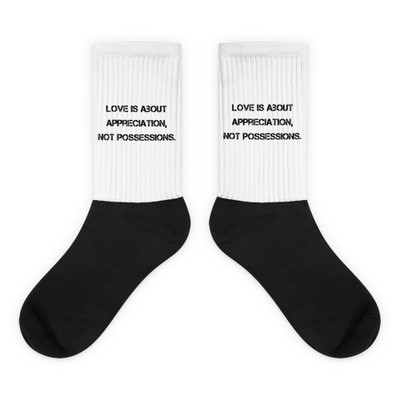 quick view Love is about appreciation, not possessions. - Black Foot Socks Motivational quotes 7810990 MSRP: $19.53 Black Foot Sublimated SocksThese socks are extra comfortable thanks to their cushioned bottom. The foot is black with artwork printed along the leg with crisp, bold colors that won"t fade. • 60% nylon/22% cotton/18% spandex • Crew length •... Add to Wish List Add to My Wish List Create New Wish List Compare