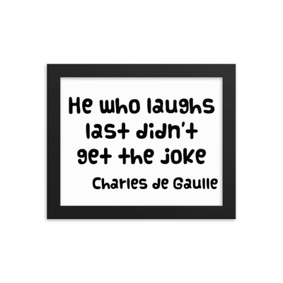 quick view He who laughs last didn't get the joke - Charles de Gaulle - Matte Paper Framed Poster Funny quotes 7832669 MSRP: $129.84 Enhanced Matte Paper Framed PosterMake a statement in any room with this framed poster, printed on thick, durable, matte paper. The matte black frame that"s made from wood from renewable forests adds an extra touch of class. • Alder, semi-hardwood... Add to Wish List Add to My Wish List Create New Wish List Compare