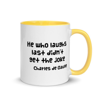 quick view He who laughs last didn't get the joke - Charles de Gaulle - Ceramic Mug with Color Funny quotes 7841440 MSRP: $21.59 Ceramic Mug with Color InsideAdd a splash of color to your morning coffee or tea ritual! These ceramic mugs not only have a beautiful design on them, but also a colorful rim, handle, and inside, so the mug is bound to spice up your mug rack. •... Add to Wish List Add to My Wish List Create New Wish List Compare