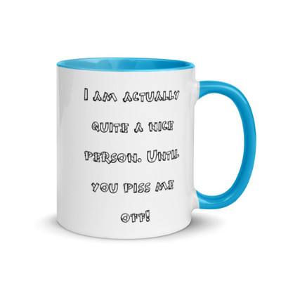 quick view I am actually quite a nice person. Until you piss me off! - Ceramic Mug with Color Funny quotes 7848442 MSRP: $21.59 Ceramic Mug with Color InsideAdd a splash of color to your morning coffee or tea ritual! These ceramic mugs not only have a beautiful design on them, but also a colorful rim, handle, and inside, so the mug is bound to spice up your mug rack. •... Add to Wish List Add to My Wish List Create New Wish List Compare
