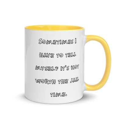 quick view Sometimes I have to tell myself it's not worth the jail time. - Ceramic Mug with Color Funny quotes 7848838 MSRP: $21.59 Ceramic Mug with Color InsideAdd a splash of color to your morning coffee or tea ritual! These ceramic mugs not only have a beautiful design on them, but also a colorful rim, handle, and inside, so the mug is bound to spice up your mug rack. •... Add to Wish List Add to My Wish List Create New Wish List Compare