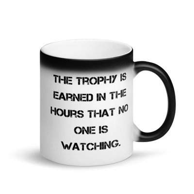 The trophy is earned in the hours that no one is watching. - Glossy Black Magic Mug Motivational quotes 7848692